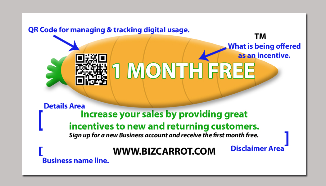 The best way to utilize this program is to use BizCarrot Cards because even though many people are tech savvy, a physical card is still one of the most powerful marketing tools. A card also tends to be kept and reminds the customer about your business. People who have a card like this will frequently show it to friends, increasing the chance that your BizCarrot will work.